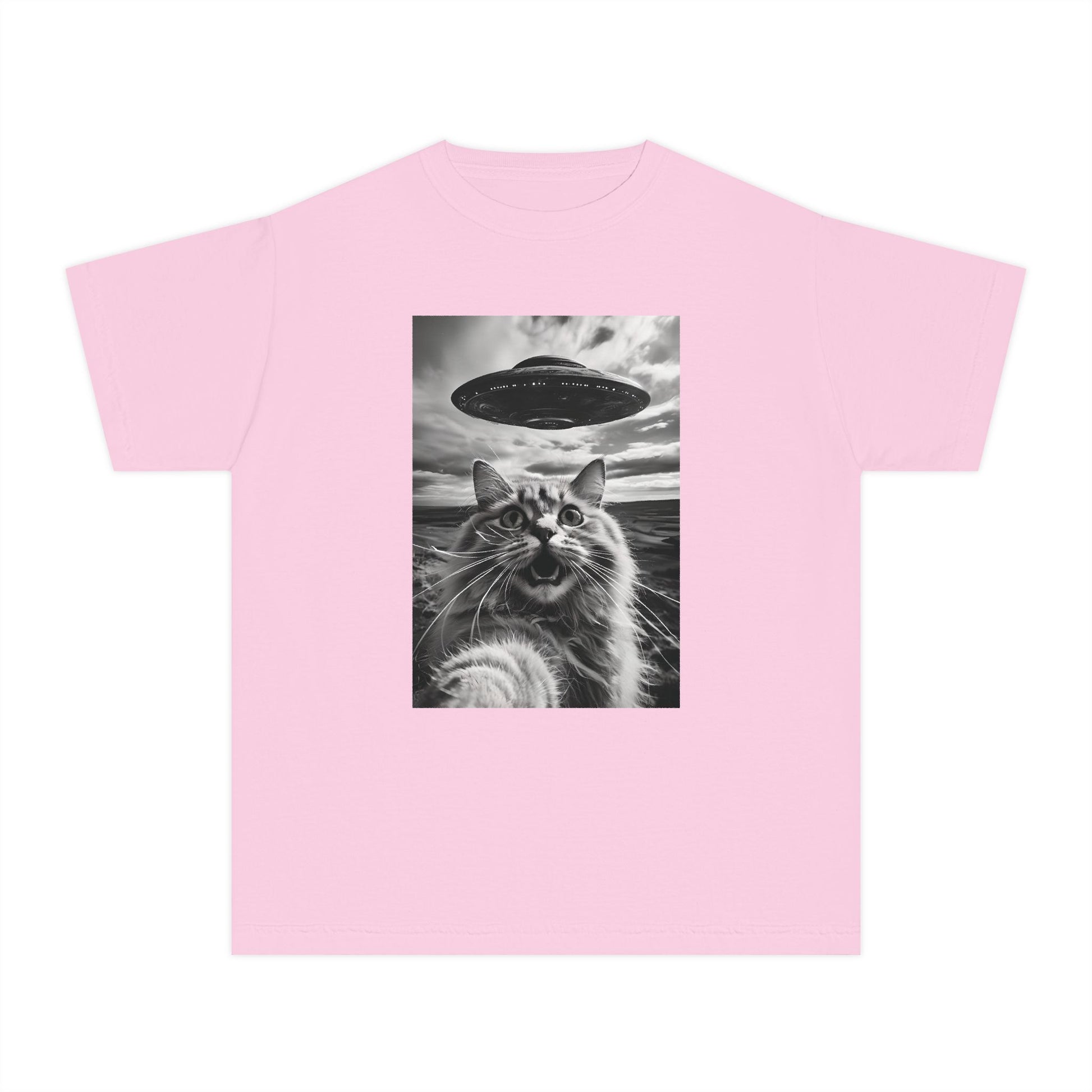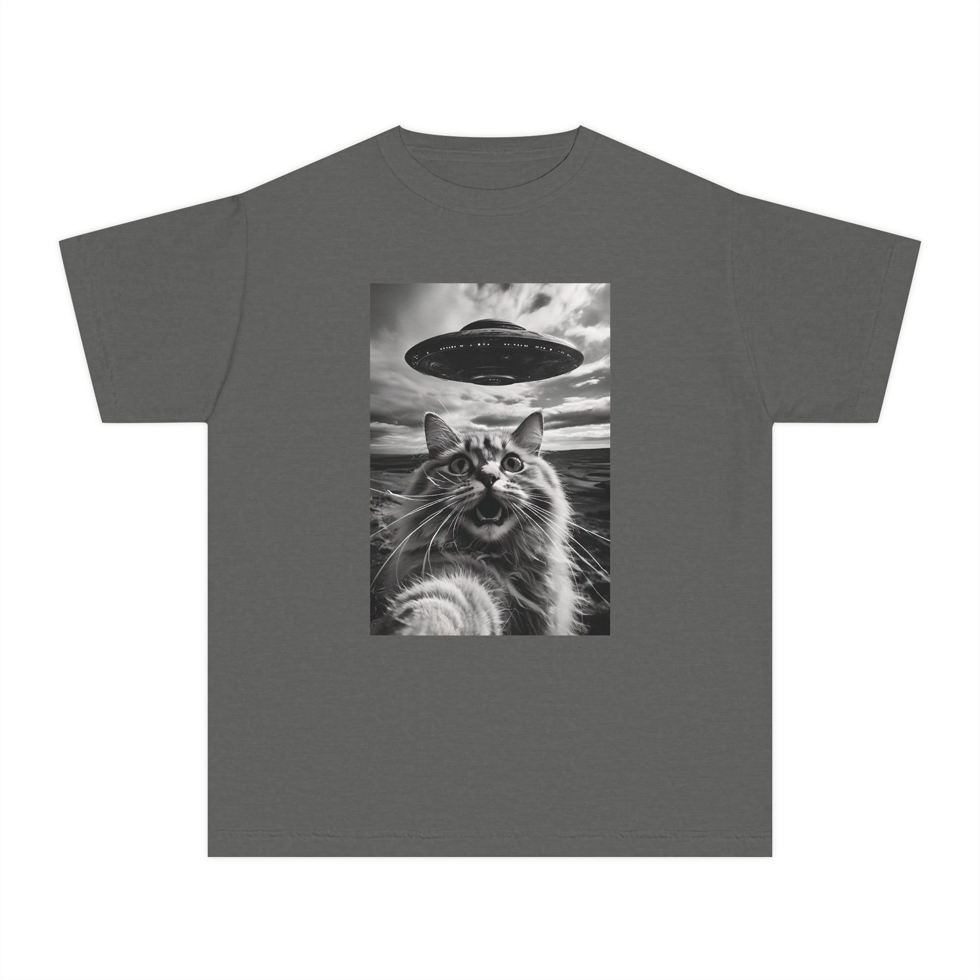 Cat Selfie with Alien UFO Weird Funny Meme Graphic Kids T-Shirt Comfort Colors 9018